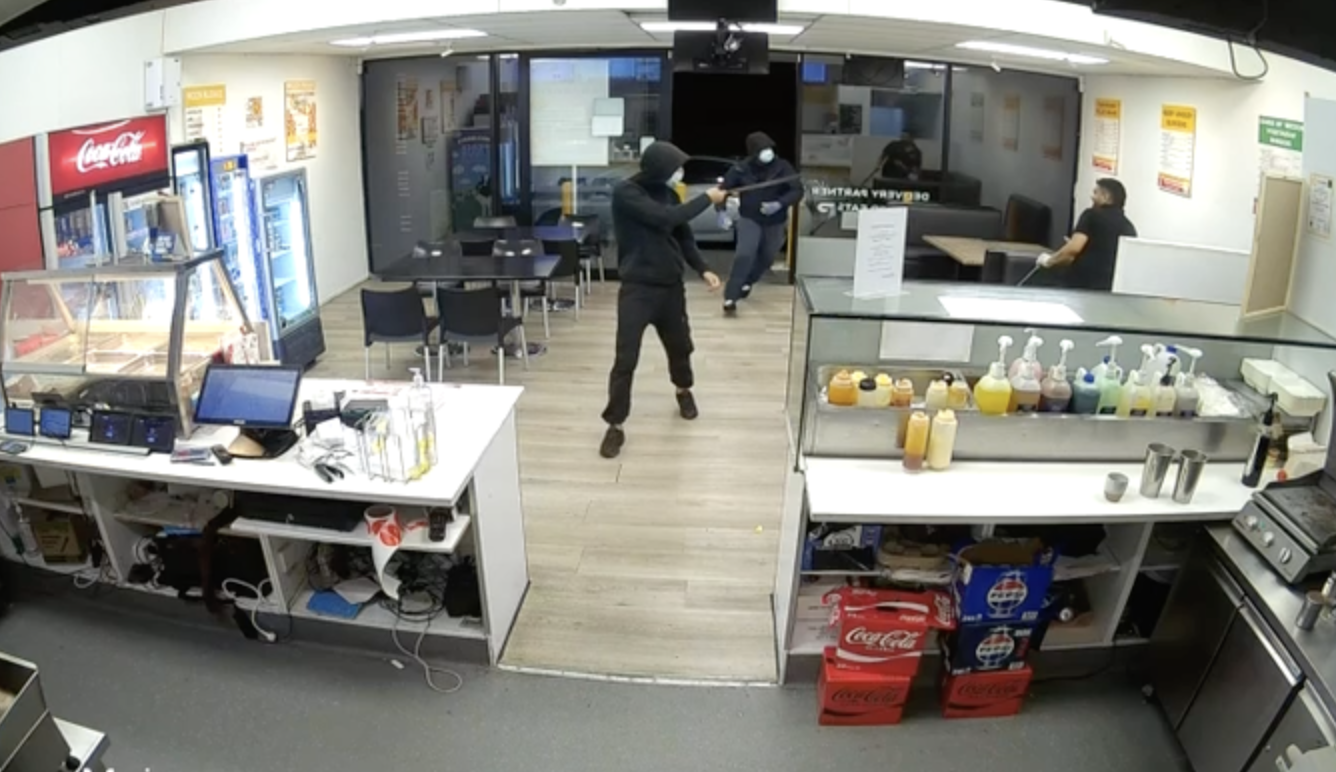 The second robbery took place on 13 March, around 1.00 am. The CCTV of the second robbery showed one staff member mopping the floor, and the second staff member back in the kitchen, when the two masked men entered and threatened them with a weapon.