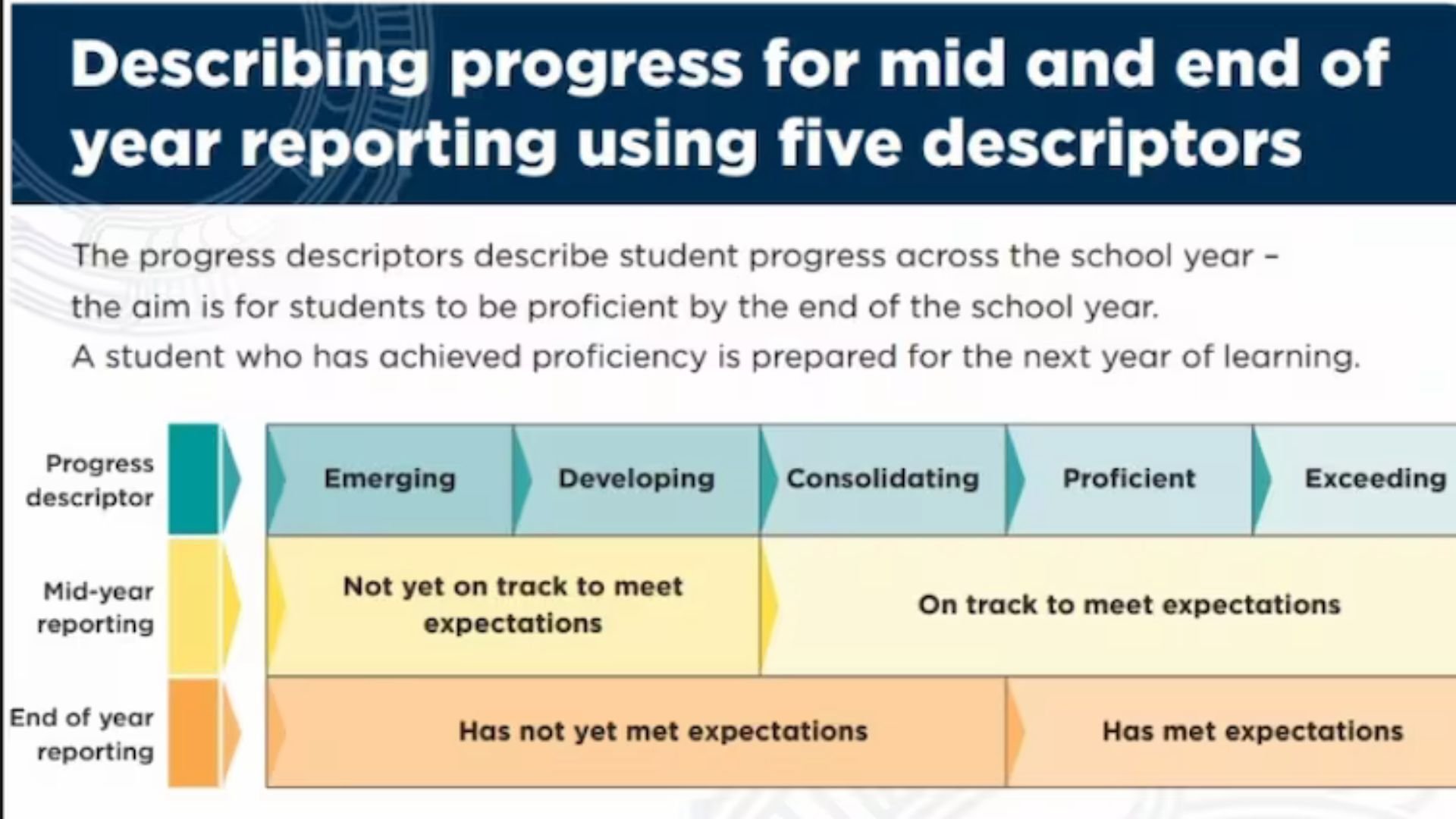 Under the framework, parents of students in Years 0–10 will receive reports using one of five progress descriptors to outline learning progress in key subjects. These descriptors are Emerging, Developing, Consolidating, Proficient, and Exceeding.