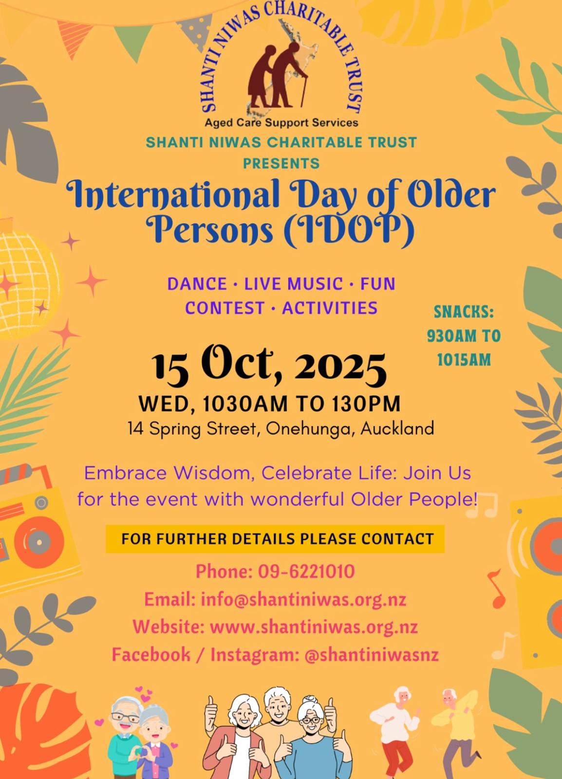 Shanti Niwas Charitable Trust Inc., an organisation devoted to promoting the dignity and well-being of senior citizens, will be observing the International Day of Older Persons (IDOP) on Friday, October 15, 2025, at its centre located at 14 Spring Street, Onehunga, Auckland. The event will run from